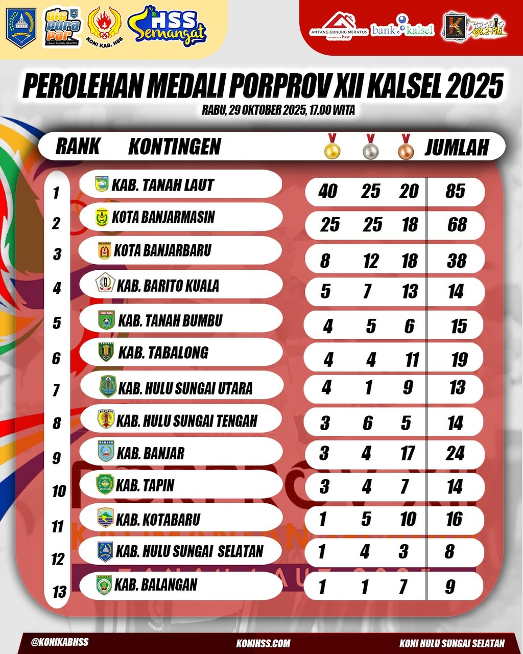 Berikut merupakan PEROLEHAN MEDALI Sementara PORPROV XII KALSEL 2025 per hari Rabu, tanggal 29 Oktober 2025